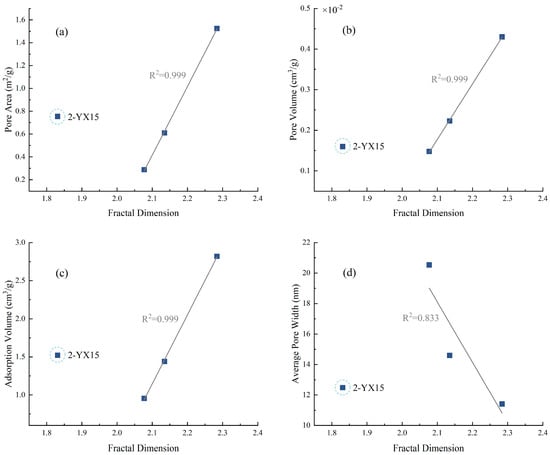 Since the fractal dimension of the 2-YX15 sample is anomalous, it is highlighted separately. As shown in Figure 8a–c, the pore area, pore volume, and gas adsorption capacity all show a positive correlation with the fractal dimension. This is because the fractal dimension is positively correlated with the degree of structural deformation in coal. As the degree of deformation increases, both the pore specific surface area and pore volume in coal also increase [15]. An increase in pore specific surface area and volume creates more adsorption sites for gas molecules, thus improving the adsorption capacity.