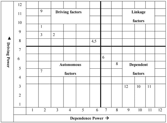 The MICMAC approach was developed to analyze complex systems in a systematic way []. Factors are classified via MICMAC analysis according to their pertinent driving and dependence power, which is illustrated in Figure 1.