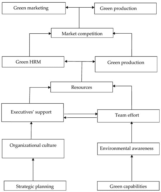 Green capabilities mean the capacity of businesses to develop, integrate, and reorganize their skills in order to thrive in current fast-paced, fiercely competitive markets. Previous research has identified four categories of capabilities: relational, organizational, knowledge-based, and strategic []. Effective technology capabilities may help businesses expedite the production of new products, adjust their operations to changing operating circumstances, and foster open innovation to enhance organizational growth and productivity [,].