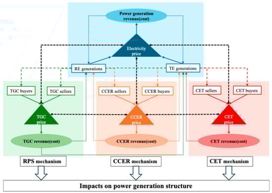 Due to the similarity between CET and RPSs in terms of their effects and modes of action, many scholars have carried out studies related to the coupling mechanism of CET-RPS. Under the CET–RPS policy, the prices of TGC, CET and electricity markets influence each other. Electricity prices and carbon market prices are complementary to green certificate market prices [24]. Rising carbon prices will lead to rising on-grid electricity prices and falling green certificate electricity prices [25]. The SD simulation results reveal that the introduction of the carbon market policies will make the electricity market, green certificate market and carbon market unstable, increase the equilibrium price of the electricity market, and reduce the equilibrium price of the green certificate market [26], which once again confirms the conclusion that equilibrium prices will influence each other in the context of multi-market coupling [27].