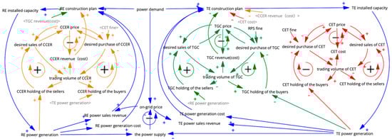 Based on the system boundary analysis, the further breakdown of the variables in the subsystems and the identification of the causal relationships between the variables form a causal loop diagram (Figure 2). The model develops the following seven main causal relationships. The diagram distinguishes the subsystems with different colors as Figure 1. Positive feedback loops reflect the feedback mechanism between TGCs, CET, and CCER prices; generator holdings; expected trading volumes; and actual trading volumes.