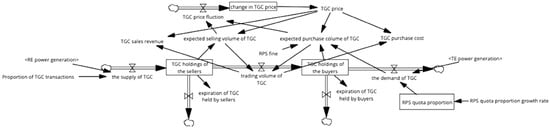TGCs prices are affected by supply and demand, while the actual trading volume depends on the trading willingness of power generators. On the one hand, the purchasing decisions of TE generators not only depend on market prices and holdings but are also mandated by the RPS policy. Therefore, a fine coefficient is brought in to represent the impact of an RPS fine on TE power generators’ expected purchases. Fluctuations in the expected purchases and sales volumes in the TGC market result in constant changes in market supply and demand, which bring about fluctuations in TGC prices and ultimately form the market price under the upper- and lower-bound constraints. And the actual volume traded during the same period is determined by the lowest expected purchases and sales in the market. The price and actual trading volume of TGCs bring additional revenues or costs, thereby affecting the profit of RE and TE power generators. The formulas involved and stock flow diagram (Figure 3) are as follows: