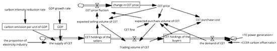 Supply and demand determine the CET price, and changes in the CET price, in turn, affect the expected purchases and sales volume of TE power generators, thereby deciding the actual trading volume. Similar to the TGC market, on the one hand, the amount of CET expected to be sold by TE generators with surplus carbon allowances depends on the market price and current holdings. On the other hand, the purchase decisions of TE generators with insufficient carbon allowances are not only influenced by market prices and holdings but also mandated by the CET policy. Therefore, a fine coefficient is introduced to represent the role of CET policy on the expected purchase volume of TE power generators. Fluctuations in the expected purchases and sales volumes in the CET market result in constant changes in market supply and demand, which bring about fluctuations in CET prices and ultimately form the market price under the upper- and lower-bound constraints. And the actual volume traded during the same period is determined by the lowest expected purchases and sales in the market. TGC prices and actual trading volume bring additional costs, which directly affect TE power generator profit. The formulas involved and stock flow diagram (Figure 4) are as follows: