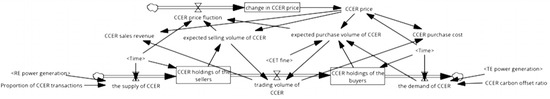 Similar to the CET market, the CCER price is subject to market supply and demand, and the actual trading volume is affected by price fluctuations and fines. When the CCER supply exceeds demand, the CCER price will fall. On the contrary, when the CCER market demand exceeds supply, the CCER price will rise. The CCER price and actual trading volume bring additional revenue or cost, thereby affecting the profit of RE and TE power generators. The formulas involved and stock flow diagram (Figure 5) are as follows: