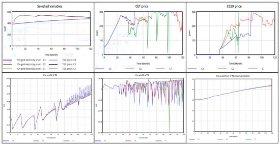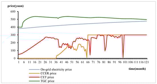 As shown in Figure 7, Under the RPS, CET and CCER mechanisms, the on-grid electricity price continues to rise in response to changes in TGC and CET prices. In the TGC market, the price increases rapidly and then gradually decreases to 500 CNY. Although the restart of CCER caused a short-term rebound in TGC prices, the downward trend has not been altered. In the carbon market, CET prices rose rapidly in the early years, rising from 50 CNY/ton to 300 CNY/ton over a two-year period and fluctuating slightly at this price level. After the CCER restart, the demand for CET declined and the price fell drastically to 150–200 CNY/ton, while the price of CCERs rose rapidly to become equal to the price of CETs within a year. As the CCER market developed, both CET prices and CCER prices stabilized, rising to a price ceiling after a period of volatility. During this period, the CET price is always higher than the CCER price, and the degree and duration of volatility are greater than that of CCER. The results show that higher CET and CCER prices bring about a continuous increase in the on-grid electricity price while also being subject to small fluctuations as a result of the TGC mechanism.