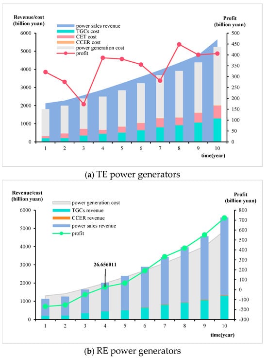 In Figure 8, under the joint trading of the TGC, CET and CCER markets, although both RE and TE power generator profits are on an upward trend during the modelling period, the profit curve of TE is more volatile and has a smaller value of increase, increasing by only 26% over 10 years. On the contrary, RE’s profit curve fluctuates less but has a greater added value, turning losses into profits since 2024, increasing by 545% in 10 years. In the cost component of TE power generators, the power generation cost is the highest, followed by TGC cost and CET cost. The revenue component of RE power generators is highest in power sales, followed by TGC revenues. However, it is worth noting that CCER does not play a big role in it, which may be because the current CCER market has not been fully developed or the participation of market players is insufficient.