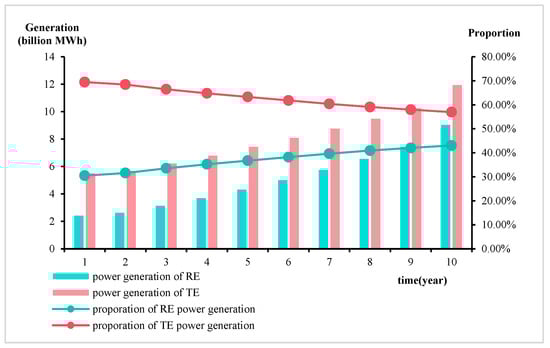 According to Figure 9, with the implementation of RPS, CET and CCER market mechanisms, RE generation will reach 4.3 trillion kWh in 2025, far exceeding the target of 3.3 trillion kWh set out in 14th Five-Year Plan for renewable energy development. In 2030, TE and RE generation will reach 11.94 trillion kWh and 9.03 trillion kWh, respectively. Within 10 years, the share of TE power generation decreases annually, from 69.49% to 56.95%, while the proportion of RE power generation increases annually, from 30.51% to 43.05%. According to this trend, in 2035, China’s RE power generation will be equal to TE power generation, and RE energy will replace TE as the primary source of power supply, optimizing the power generation structure and promoting low-carbon transformation of the electricity sector.