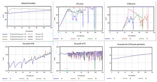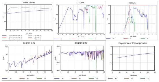 The standard scenarios of the SD model are set up based on the data in Section 3.5 to simulate the operation of the carbon–electricity–certificate market under the RPS, CET and CCER mechanisms. The results are shown below.