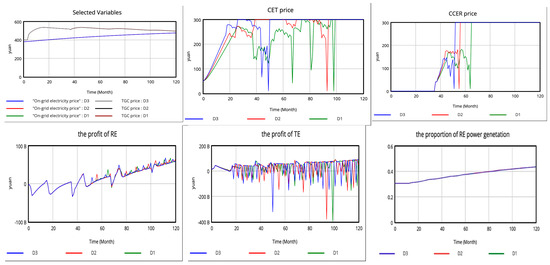 Variable values are important for model prediction accuracy. The model is simulated on a monthly cycle from 2021 to 2030, and the actual values for 2020 are chosen as the initial values of the state variables. Regarding RPS parameters, based on the data released in the “China Renewable Energy Development Report of 2023”, the ratio of renewable energy consumption to total energy consumption was 17.5% in 2022; according to the “Action Plan for Carbon Dioxide Peaking Before 2030”, the proportion of non-fossil energy in primary energy consumption will reach approximately 25% in 2030. Therefore, we set the RPS quota’s initial value to 0.159 and the monthly quota growth value to 0.0038. In order to ensure stable and orderly trading in the market and avoid significant fluctuations in TGC and CET prices, this study stipulates that the TGC benchmark price is 400 CNY/MWH, with an upper limit of twice the benchmark price and a lower limit of half the benchmark price. In terms of carbon market parameters, the carbon emission quota of the power market is allocated free of charge based on the total national carbon emissions and the proportion of the power market in national carbon emissions (40%). Based on the carbon prices of seven pilot regions nationwide, the initial price of CET is 50 CNY/ton and the initial price of CCER is 40 CNY/ton. The price range of CET and CCER is 10–300 CNY/ton. In terms of electricity market parameters, by the end of 2020, China’s new and cumulative installed capacities of RE and TE power generation were 139,000 MW, 51,870 MW, 934,000 MW and 1,263,647 MW, respectively. The values of the important parameters are given in Table 1.