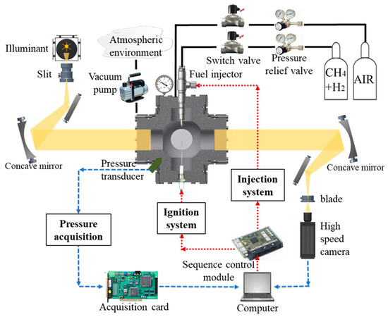 The schlieren system [40], combined with a high-speed camera (IDT Motion Pro-Y4) and an AF-S NIKKOR 50 mm F1.4G full-frame fixed-focus lens, was used to capture real-time flame images. The schlieren system’s optical path was arranged in a Z-shape, with the CVCC located in the middle of the optical path. A pressure sensor (Kistler 6061B) was mounted on the wall of the CVCC. The charge signal from the pressure sensor was amplified by a charge amplifier and transmitted to a computer via a PCI1710U data acquisition card, enabling the real-time collection of combustion pressure signals during the combustion process.