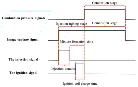 The initial temperature of the experimental process was set to 298 K, and the initial pressure was 0.1 MPa. Air was first charged into the combustion chamber, followed by the injection of methane–hydrogen mixed fuel with varying hydrogen content through the fuel injector located directly above the center of the CVCC, forming a combustible mixture. At a specific moment, the combustible mixture was ignited, and the data acquisition system was triggered simultaneously. The schematic diagram of the timing signal control is shown in Figure 2. The fuel injection pressure was set to 6 MPa. The pulse width of the fuel injection could be controlled to adjust the global equivalence ratio of the mixture inside the chamber. The mixture formation time (MFT) is defined as the time between the end of fuel injection and the ignition moment. In this study, the mixture formation times were set to 10 ms, 50 ms, 100 ms, 200 ms, and 3 min. When the MFT was 3 min, the fuel had sufficient time to diffuse, and the flow field inside the combustion chamber became nearly stable, resulting in a laminar premixed combustion process. When the MFT was relatively short, the concentration distribution within the combustion chamber became inhomogeneous, accompanied by flow disturbances. Under such conditions, the combustion process was characterized as partially premixed combustion [41]. As the MFT decreased, the degree of partial premixing of the mixture in the CVCC increased. The experimental related parameter settings are shown in Table 1.