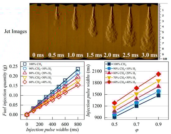 The jet characteristics of methane–hydrogen mixtures with different hydrogen contents are as shown in Figure 3. For the same fuel composition, the fuel injection quantity exhibits a linear relationship with the injection pulse width. As the hydrogen content in the mixed fuel increases, the slope gradually decreases. This is because the molar mass of hydrogen (2 g/mol) is much smaller than that of methane (16 g/mol). Based on the injection characteristics of different fuels, the injection pulse width required to create combustible mixtures with different equivalence ratios can be calculated. With an increase in hydrogen content in the mixed fuel, achieving the same equivalence ratio for the combustible mixture requires a longer injection pulse width. This is mainly because the oxygen required for the complete combustion of hydrogen is only one-quarter of that required for methane combustion.
