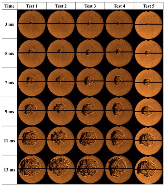 Before conducting the experiments, it is essential to validate the reliability of the experimental platform. Figure 4 shows the flame image experimental results obtained using this platform. The operating conditions are an MFT of 50 ms and an equivalence ratio of 0.85 for pure methane in a partially premixed combustion process. The flow disturbances and the inhomogeneous concentration distribution caused by the fuel jet led to the formation of wrinkles and cellular structures in the flame front, accelerating the flame propagation speed. This structure not only reflects the enhancement effect of turbulence on flame propagation but also highlights the significant impact of local concentration gradients on the chemical reaction rate. This demonstrates the strong coupling between the flow field, concentration field, and combustion reactions in the partially premixed combustion process. Although there are slight differences in the development of the local flame structure during different testing processes, the macroscopic cellular structures, wrinkle patterns, and flame propagation speed of the flame front are almost identical. Some errors and uncertainties inevitably arise during the experiment. The initial temperature and pressure errors are ±3 K and ±0.1 kPa, respectively. The uncertainty in the combustion pressure measured by the Kistler 6061B pressure sensor is ±0.8%. The precision of the injection and flame images is 0.25 mm/pixel. To improve accuracy, the experiments were repeated three times in this study.