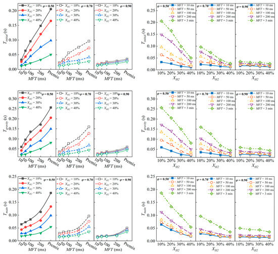 As the MFT decreases, the mixture in the combustion chamber has less time for component diffusion and turbulent dissipation, enhancing the degree of partial premixing. At this stage, high-concentration regions coexist with low-concentration regions in the combustion chamber, accompanied by flow field disturbances. Additionally, the flow field and concentration field continue to evolve due to turbulence dissipation and concentration diffusion, placing the mixture in a typical partially premixed state. This process is similar to the working environment of a gas fuel engine combustion chamber with in-cylinder direct injection technology. The effects of the degree of partial premixing and hydrogen content on the characteristic combustion durations of mixtures with different global equivalence ratios are shown in Figure 5.