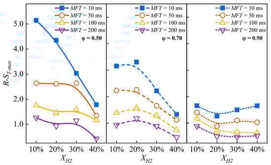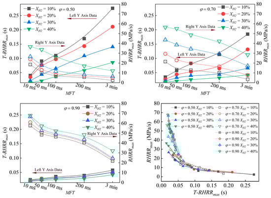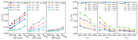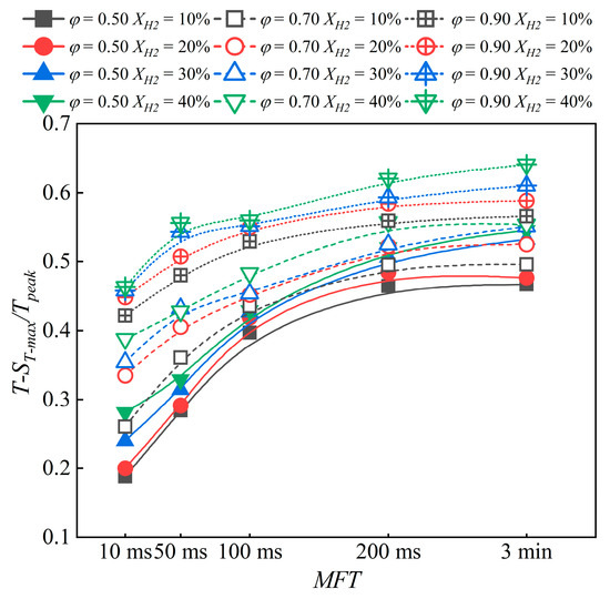 Figure 8 illustrates the impact of the partial premixing degree on the peak representative heat release rate and its timing under various conditions. As the MFT decreases, the degree of partial premixing increases, resulting in a higher and an earlier . This trend is observed across combustion processes with different equivalence ratios or hydrogen contents. This indicates that the degree of partial premixing has a general enhancing effect on the heat release rate and the dynamic characteristics of the heat release process. For mixtures with the same global equivalence ratio but varying hydrogen content, the effect of the partial premixing degree on the remains similar (have similar slope), while its influence on the gradually weakens with hydrogen content increases. This is because in high-hydrogen-content mixtures, the combustion reaction rate is primarily governed by the chemical properties of hydrogen, while the marginal impact of turbulent mixing and concentration non-uniformity on heat release is relatively low. Under the same MFT, the increases with higher hydrogen content. The high diffusivity and low ignition energy of hydrogen significantly enhance localized combustion reactions, thereby accelerating the heat release rate and advancing the occurrence time of the peak heat release rate. The effect of hydrogen content on the of partially premixed combustion is most significant for mixtures with an equivalence ratio of 0.7.