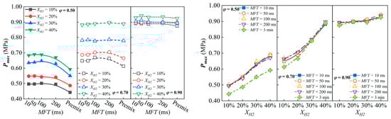 As shown in Figure 6, the peak combustion pressure trends are illustrated for partially premixed combustion processes with mixtures of different compositions. The enhancement of peak combustion pressure by the degree of partial premixing is relatively weak when the mixture’s components remain constant. As the MFT decreases, the degree of partial premixing increases, enhancing the non-uniformity of combustion reactions in the mixture. This effect accelerates the heat release rate during the early combustion stage, resulting in a slight increase in combustion pressure. It is worth noting, however, that when the MFT becomes very short, the peak combustion pressure does not increase due to reduced heat loss; instead, it may even decrease slightly. The main reason is that the injected fuel has insufficient time to diffuse, causing parts of the mixture to exceed the flammability limits, leading to localized incomplete combustion and thereby limiting the further increase in pressure.