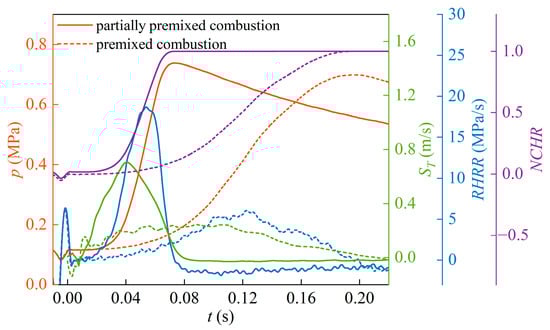 Figure 7 illustrates the combustion characteristic parameter curves for premixed and partially premixed combustion processes, including combustion pressure , burning velocity , representative heat release rate RHRR, and normalized cumulative heat release rate NCHR. The combustion conditions are as follows: an equivalence ratio of 0.7, a hydrogen blending ratio of 20%, and mixture formation times of 100 ms (partially premixed combustion, solid line) and 3 min (premixed combustion, dashed line). In the premixed combustion process, the rise in combustion pressure is relatively gradual, with a relatively steady burning velocity and a lower heat release rate. During the 0.04–0.12 s combustion period, the burning velocity remains nearly constant. This phenomenon can be attributed to the uniform concentration distribution of the mixture in premixed combustion, where the combustion reaction is primarily governed by chemical reaction kinetics, resulting in a relatively low and stable flame propagation speed. When the MFT is shortened, the combustible mixture transitions to a partially premixed state, exhibiting significantly different combustion characteristics. Under this condition, the mixture concentration within the combustion chamber becomes inhomogeneous, with higher concentrations near the ignition electrode at the chamber’s center and lower concentrations near the combustion bomb wall. The presence of this concentration gradient significantly enhances combustion reactions in locally fuel-rich regions, particularly in the central area where the concentration and turbulence intensity near the spark plug are higher, accelerating the propagation of combustion chain reactions. The fuel injection dynamics further amplify the turbulence effects, leading to a substantial increase in flame propagation speed and heat release rate. Compared to premixed combustion, the heat release rate curve of partially premixed combustion exhibits a rapid rise to a peak followed by a sharp decline, forming a distinct single-peak profile. This rapid heat release directly drives a rapid increase in combustion pressure while shortening the combustion duration. The burning velocity and the representative heat release rate curve exhibit similar variation patterns. Due to the identical composition of the combustible mixture, the peak combustion pressures in premixed and partially premixed combustion processes are comparable. This is because the combustible mixture composition in both combustion processes is identical, resulting in a similar total heat release amount that determines the peak combustion pressure. However, due to the higher combustion reaction rate in partially premixed combustion, the heat release process is more concentrated in the early combustion stage, leading to a significantly higher pressure rise rate compared to premixed combustion.