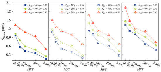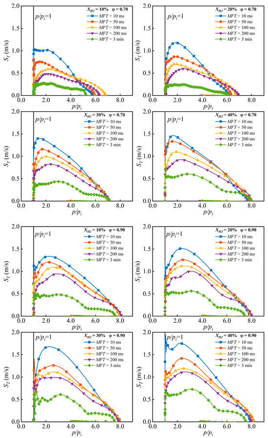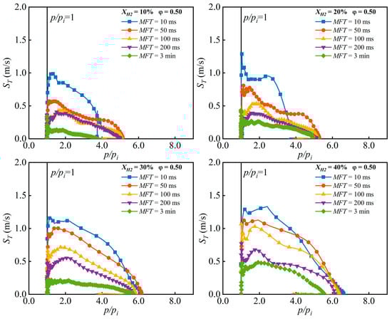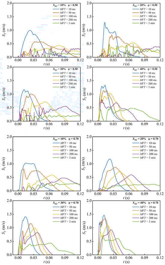 Shortening the MFT leads to an inhomogeneous concentration distribution of the mixture within the combustion chamber accompanied by flow field disturbances, at which point the burning velocity of the partially premixed mixture is constantly changing. Figure 10 shows the variation in burning velocity with combustion time under different operating conditions. For mixtures with different compositions, the burning velocity curve has a similar trend to the heat release rate curve, showing a rapid rise to a maximum value followed by a relatively slower decrease. This is because, in this study, central ignition is used. During the initial combustion phase, the flow field near the spark plug is relatively strong and the mixture concentration is higher, leading to a rapid increase in the burning velocity, which reaches its peak. As the flame propagates from the central region toward the chamber walls, the flow field disturbances gradually weaken and the mixture concentration becomes more diluted, causing the burning velocity to decrease. During the later stages of combustion, flame propagation is constrained by the structure and walls of the combustion chamber. This geometric confinement inhibits the further development of the flame front, while wall effects increase heat loss, thereby reducing the burning velocity until the combustion process is complete.