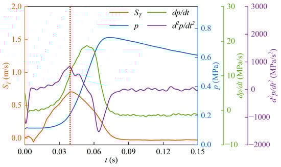 The heat release characteristics of the partially premixed combustion process were analyzed by processing and analyzing the combustion pressure signal using MATLAB R2021a. Due to the fast combustion rate and short duration of partially premixed combustion, heat transfer losses during the process are often neglected [48,49]. This study is conducted using a constant-volume combustion bomb platform, where the combustion chamber volume remains fixed. Consequently, the heat release rate is directly proportional to the pressure rise rate during combustion. The representative heat release rate (RHRR) [50] is calculated as
