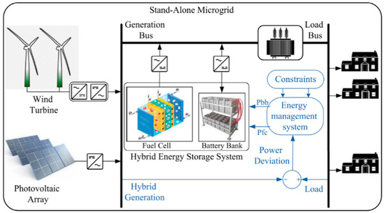 In [40], the concepts of utilization factor and hydrogen fuel flow were introduced into the HESS based on the fuel cell as the main and battery as the auxiliary. It enabled FC to achieve the ability to compensate for fast power transients, thus improving the dynamic response capability of HESS. Figure 1 shows its independent microgrid.