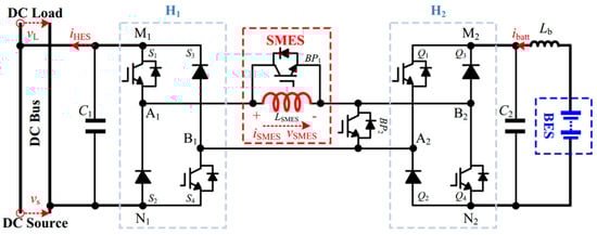 The system mainly consists of two converters (H1 and H2), an SMES coil, and a battery. The converters H1 and H2 consist of two controllable IGBT switches and two diodes, namely S1–S4 and Q1–Q4, respectively. SMES are embedded between the joints A1 and B2 of the two converters. The connection of B1 and A2 is used for current continuity. The battery is connected to the H2 output ports M2 and N2. H1 output ports M1 and N1 connect to the DC bus on the battery side. Two capacitors C1 and C2 are used for filtering. In industrial applications, two additional switches (BP1 and BP2) are added to the structure in order to enable the S-B HESS to continue working when one of the energy storage units is damaged or stopped. When the SMES fails, BP1 will be activated, and S-B HESS will work as a single battery energy storage device. In contrast, when the battery fails to function properly and the system works in single-SMES mode, BP2 will be activated to isolate the battery part.