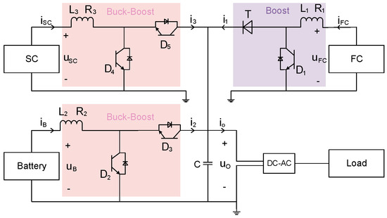 Circuit topology of the FC-Battery-SC HESS.