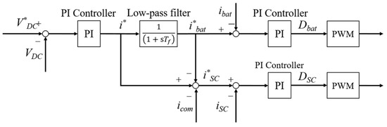 In a traditional LPF controller, the DC grid voltage is first compared to the reference voltage , and the error is provided to the proportional integration (PI) controller. The PI controller generates the required total HESS current . Then is divided into a low frequency reference current (for batteries) and a high frequency reference current (for SC). Therefore, through the current reference, LPF allocates the reference power of energy storage devices to: