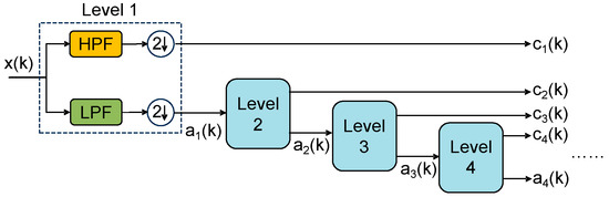 The wavelet transform can be used to isolate the low-frequency component from the high-frequency component [61]. At the same time, the wavelet transform also gives a concept of the storage system capacity required to suppress the high-frequency component, so it is an effective method to smooth the PV fluctuation power [62]. A power adaptive smoothing suppression method for the point of common coupling with distributed PV energy storage based on empirical wavelet transform was proposed in [63]. The PV power is decomposed adaptively by empirical wavelet transform, and the HESS power is distributed according to the response capacity of different energy storage components. In addition, an active power compensation SOC control strategy is provided for HESS SOC. The structure of the wavelet filter bank is shown in Figure 8.