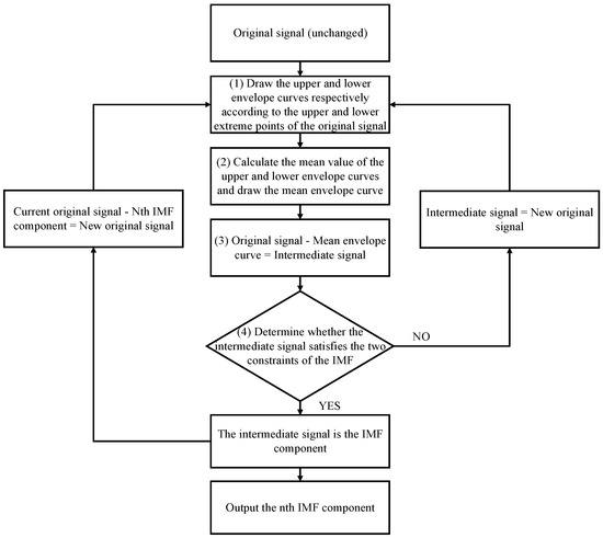 EMD can decompose the PV power signal into multiple intrinsic mode functions (IMF) and a residual component. For example, the power of short-time sharp changes caused by rapid cloud movement is decomposed into high-frequency IMF, while the power of slow changes caused by seasonal changes may appear in low-frequency IMF or residual components. We can formulate corresponding power smoothing strategies for different frequencies’ IMF based on the results of EMD decomposition [64]. Zheng et al. [65] proposed a hybrid energy storage smooth output fluctuation control strategy based on considering PV dual evaluation indexes. The EMD will be continued again when there are abnormal signals in the process of ensemble EMD. Then, the final modal component will be obtained by removing the pseudo-component. We can reconstruct the power based on the grey relational degree, and the smooth power output fluctuation instructions for SC and battery will be obtained. Volatility and smoothness are two evaluation indexes, according to different time scales, and moving average filtering is used as the instruction. The battery pack (5 min scale) and SC pack (1 min scale) in hybrid energy storage coordinate and control PV smoothing output fluctuation. The EMD steps are shown in Figure 9. Among them, the two constraints of the IMF are: