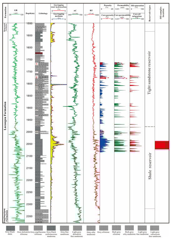 The Yongfeng sub-sag is located in the western section of the Chaiwopu sag on the southern edge of Bogda Mountain (Figure 1), with an area of about 1500 km2. The sedimentary strata in the study area are mainly Permian to Jurassic, and the Middle Permian Lucaogou Formation has developed high-quality lacustrine source rocks with a large sedimentary thickness, providing an important material basis for oil and gas accumulation in the study area []. The study area relies on the source rocks of the Lucaogou Formation for hydrocarbon supply, which can form multiple sets of reservoir combinations vertically and develop various types of oil and gas reservoirs, coexisting with conventional and unconventional oil and gas reservoirs. Among them, the Permian Lucaogou Formation has a well-developed source and reservoir relationship, forming interbedded shale oil and gas reservoirs as well as adjacent tight sandstone oil and gas reservoirs (Figure 2). Moreover, it is distributed continuously on the plane, not controlled by structures, with a large area and overall resource scale, making it the most important exploration target layer in the study area.