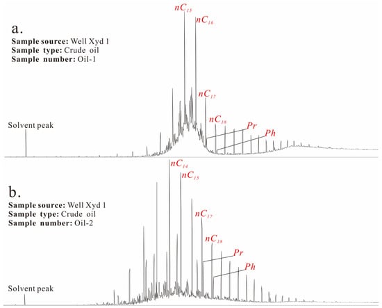 The gas chromatography–mass spectrometry analysis results show that the carbon number distribution range of n-alkanes in the saturated hydrocarbon fractions of two crude oil samples from the Xinyingdi 1 well is nC9–nC32, and the main peak carbon number is concentrated in nC14–nC15. The oil sample Oil-1 suffered from a certain degree of mud contamination, and the baseline of the Oil-2 sample’s alkane chromatography also showed obvious “UCM” (Unsolved Complex Mixture) bulges, which is sufficient to prove its potential for biodegradation. The distribution of CPI ranges from 1.09 to 1.18, and the distribution of OEP ranges from 1.06 to 1.13. Normal alkanes have a slight odd–even advantage, indicating that the maturity of crude oil is in the early to mid-maturity stage and has not yet fully reached the peak of mature oil generation (Figure 3).