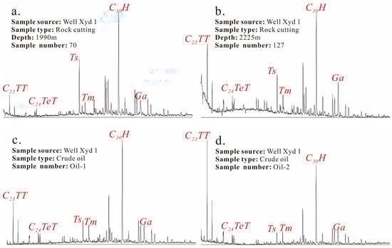 Among the numerous biomarker parameters in the terpene series, tricyclic and tetracyclic terpenes play extremely important roles and can provide a lot of information about the source material of oil. Tricyclic terpenes are widely distributed in petroleum and sedimentary organic matter, possibly originating from the cell membranes of protozoa, with tricyclohexaisoprenol as its precursor [], and algae as another source []. C24 tetracyclic terpenes are widely distributed in crude oil and rock extracts. Many scholars believe that the abundant C24 tetracyclic terpenes are often associated with terrestrial parent materials [,]. Therefore, the relative content of C24 tetracyclic terpenes and tricyclic terpenes can reflect the organic matter source of crude oil. Generally speaking, in source rocks from lower organic matter and related crude oils, C23 tricyclic terpenes dominate, while C24 tetracyclic terpenes have relatively low content; however, C19 and C20 tricyclic terpenes are more abundant in source rocks and related crude oils derived from terrestrial organic matter, and the content of C24 tetracyclic terpenes is relatively high. Abundant terpenoids are detected in the crude oil and source rock extracts of Well Xyd 1, including pentacyclic triterpenes, tricyclic terpenes, tetracyclic terpenes, and gammacerane (Figure 4). Among them, the main peaks of tricyclic terpenes are C21 and C23, indicating that the contribution of lower aquatic organisms dominates in their organic matter sources.