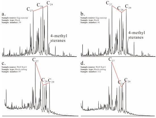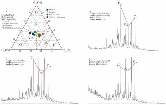 The distribution characteristics of C27-C28-C29 regular steranes are commonly used to indicate the species contributing to sedimentary organic matter. Generally, the dominance of C27 regular steranes indicates the contribution of algae and aquatic organisms, while the dominance of C29 regular steranes reflects the contribution of terrestrial higher plants []. The C27-C28-C29 regular sterane source identification chart (Figure 5a) shows that the hydrocarbon generating parent materials of the crude oil from Well Xyd 1 all have contributions from phytoplankton and terrestrial plants; the distribution of regular steranes shows a “V” shape distribution of C27 to C29 (Figure 5b–d), indicating that their organic matter is mainly contributed by algae, aquatic organisms, and terrestrial higher plants.