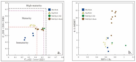 As the degree of thermal evolution increases, the R configuration of regular steranes will transition to the S configuration, and similarly, the less thermally stable α configuration of regular steranes will transition to the β configuration [,]. The crude oil sample from Well Xyd 1 has weak odd–even dominance. In addition, the regular sterane isomerization parameters show that the crude oil in this area has basically not exceeded the equilibrium endpoint and is in the mature interval, so it is judged that the crude oil is from the mature source rock. The regular sterane isomerization parameters of the source rock extracts from the Gjg and Dhs outcrops show that their maturity is in the low-maturity to mature stage (Figure 6a).