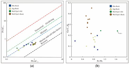 Figure 9b shows the correlation between the Pr/Ph and gammacerane index in the crude oil and source rocks in the Yongfeng sub-sag. Both of these parameters can effectively reflect the sedimentary environment during the deposition of the source rock. The gammacerane index of source rock extracts from the Gjg and Dhs outcrops is less than 0.2. The gammacerane index of crude oil and source rock extracts from Well Xyd 1 is more than 0.2. This difference provides a strong basis for us to distinguish source rocks in different sedimentary environments. It is worth noting that the Pr/Ph value of the crude oil sample Oil-1 from Well Xyd 1 is relatively high, which may be related to mud contamination. However, overall, the sedimentary environment of the crude oil and source rocks in Well Xyd 1 is similar.