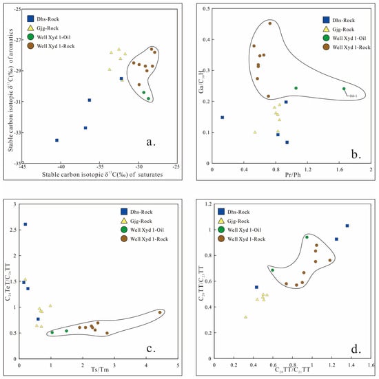 Figure 9a shows the correlation between stable carbon isotopes (δ13C) of saturates and aromatics of the crude oil and source rocks in the Yongfeng sub-sag. The stable carbon isotope of saturates in the crude oil and source rock extracts of Well Xyd 1 ranges from −30.6‰ to −28.2‰, that in the Gjg outcrop is from −33.7‰ to −31.7‰, and that in the Dhs outcrop is from −40.5‰ to −32.2 ‰. By comparison, it can be found that the crude oil and source rock extracts from Well Xyd 1 have relatively heavy carbon isotope values, and the sample data distribution shows high consistency. However, due to the lack of clear regularity in the stable carbon isotopes of aromatics in crude oil and source rocks in the Yongfeng sub-sag, further tracing of the origin of crude oil in Well Xyd 1 requires the use of more biomarker parameters for judgment.