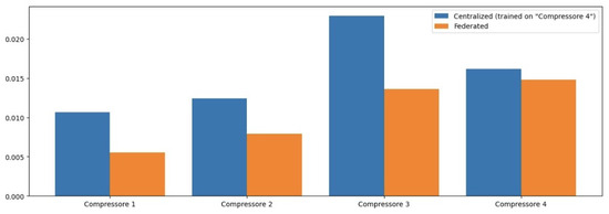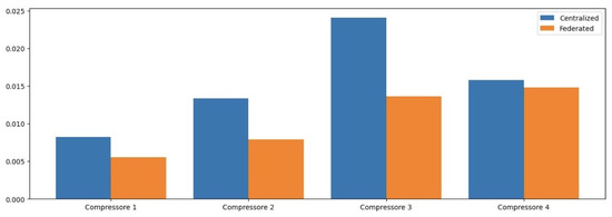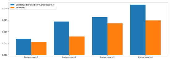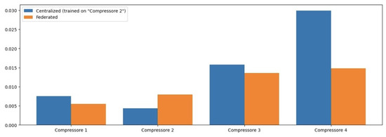 As seen in the histogram for Compressor 2, the centralized model outperforms the federated approach due to the constant values in its test set, which aligns closely with the patterns learned during training. This situation underscores a critical aspect of predictive maintenance: while FL enhances generalization across diverse operational scenarios, it may not always outperform a model specifically tuned to a particular machine’s historical data when that machine experiences consistent operational states.