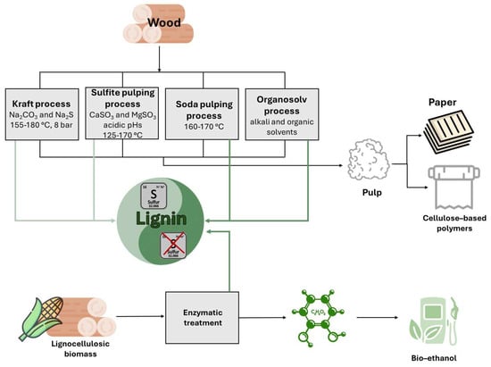 The alternative sulfite pulping process [16] implies the reaction of wood with calcium or magnesium sulfites at acidic pHs and temperatures of 125–170 °C. After pulp separation, fermentation of residual sugars to ethanol, and further membrane filtration for reduction in the metal ion content, lignosulfonates are produced, with 5 wt.% sulfur content [22]. These materials are the most exploited for several industrial applications such as adhesives, binders, surfactants, and dispersing agents.