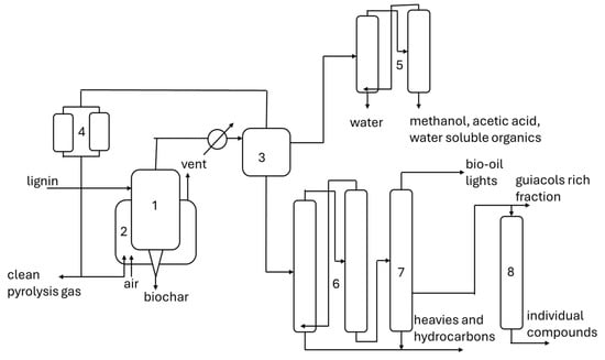 Possible flowsheet of a slow lignin pyrolysis process. 1—pyrolysis reactor; 2—burner; 3—phase separation drum; 4—pyrolysis gas desulfurization by adsorption on activated carbons; 5—solvent extraction of organics from water fraction; 6—solvent extraction of oxygenated organics from crude bio-oil; 7—distillation; 8—column chromatography.