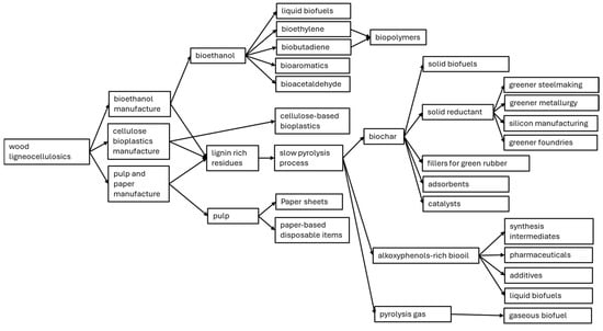 In fact, the production and use of plant-derived carbon materials (biochar) can represent an optimal way to replace coal-derived carbon materials such as coke as a solid fuel and as a reducing agent in metallurgy as well, thus contributing to the defossilization of technologies with a reduction in fossil-derived carbon oxide emissions. Additionally, biochar can be applied as a green material to produce fillers for rubbers and catalytic and adsorption materials. Additionally, the coproduction of complex organic molecules such as methoxy and alkoxy phenols arising from slow lignin pyrolysis bio-oils can contribute to the green production of chemical intermediates and pharmaceuticals, which today are produced from oil-derived chemical intermediates.