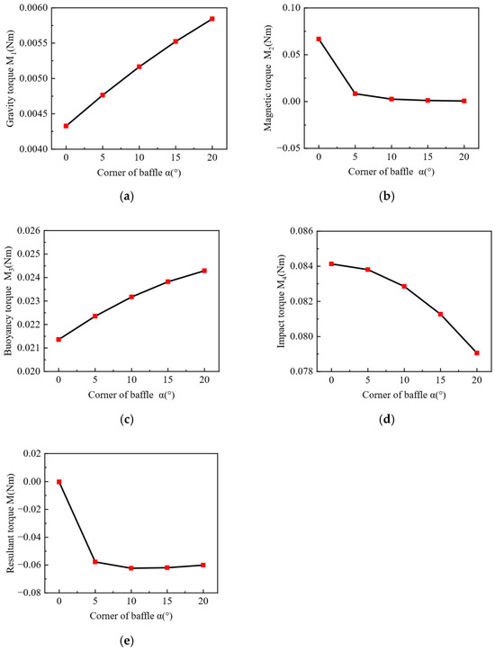 Torque diagrams at different baffle angles: (a) gravity torque diagram; (b) magnetic torque diagram; (c) buoyancy torque diagram; (d) impact torque diagram; (e) resultant torque diagram.