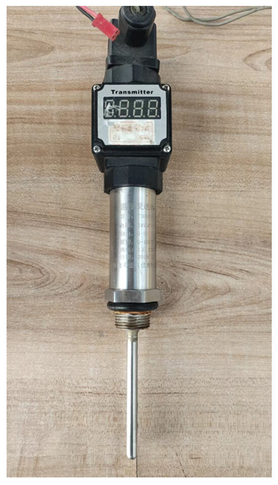 The temperature sensor selected is a contact type temperature sensor, as shown in Figure 9, the manufacturer is Anhui Tiandao Instrument Manufacturing Department of China Hefei, model is TDHSM-010, and measuring range is 0–100 degrees. The pressure sensor selected is YD-322H14V514BG, manufactured by Suzhou Xsenr Instrument Technology Co., Ltd., located in Suzhou, China. It has a response frequency of 500 Hz and a response time of 2 ms, and is installed at the front end of the gas relay to test the fluid pressure at the inlet of the gas relay, as shown in Figure 10. The technical parameters of the pressure sensor are shown in Table 2.
