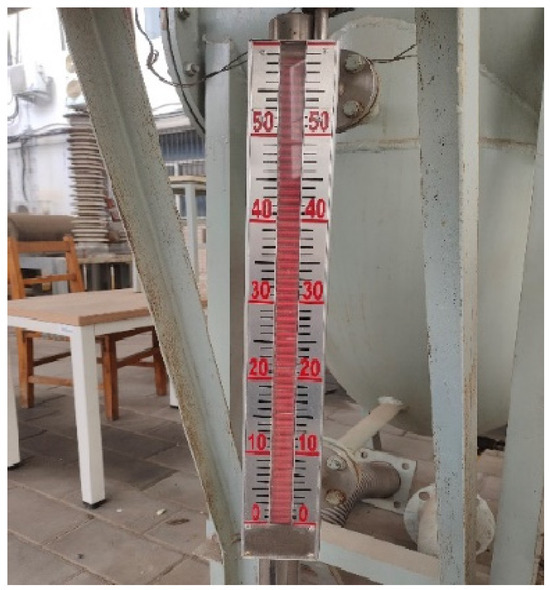 The flow velocity sensor adopts the FLUXUS F721 non-contact ultrasonic flow velocity sensor from Emerson’s Flexim Americas division, located in New York, NY, USA, as shown in Figure 11. The technical parameters of the flow velocity sensor are shown in Table 3. The response time is 20 ms, and the measurement range is between ±0.01 m/s and ±25 m/s. Compared with traditional contact flow velocity sensors, the F721 sensor can effectively reduce interference with the internal oil flow state of pipelines, significantly improve testing accuracy, and create favorable conditions for accurately obtaining oil flow velocity data. The flip plate level gauge, shown in Figure 12, is selected with model number UHZ-519, manufactured by Taizhou Xinrongming Automation Equipment Co., Ltd., located in Taizhou, China. The technical parameters of the flip plate level gauge are shown in Table 4.