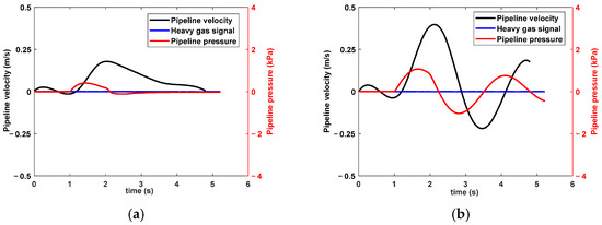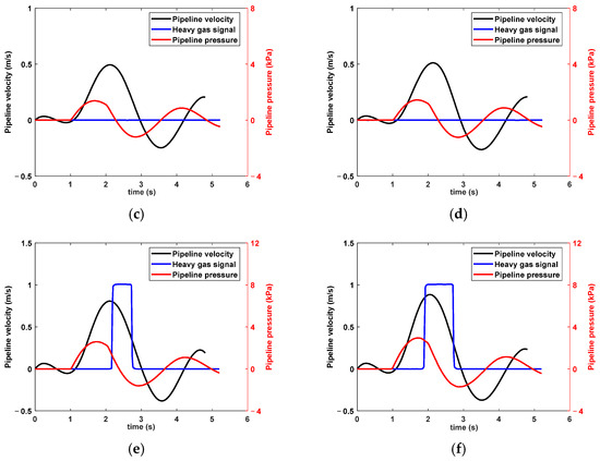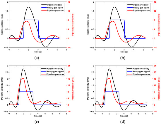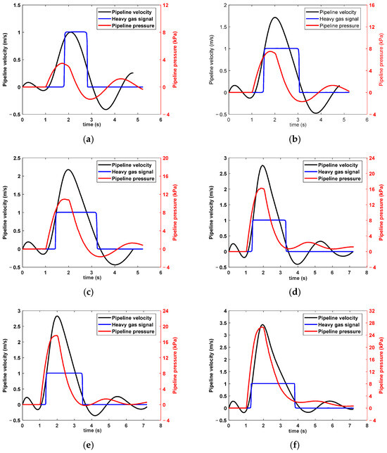 To investigate the action signals of heavy gas under different transient oil flows, multiple repeated experiments were conducted to collect the pressure, flow velocity, and heavy gas signals of pipeline oil flow during the transient oil flow impact process, as shown in Figure 14.
