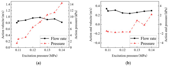 Pressure and flow velocity curves of heavy gas under different excitation pressures: (a) pressure and flow velocity at heavy gas action; (b) pressure and flow velocity at the end of heavy gas action.