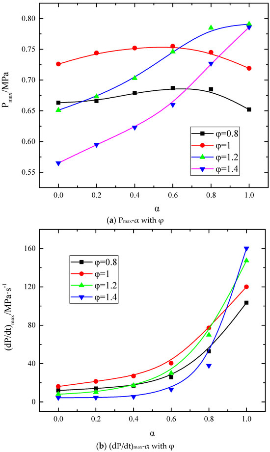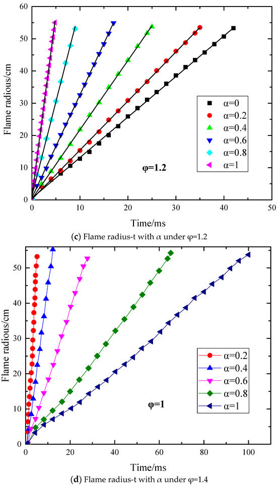 - As the volume fraction of hydrogen increases, its impact on the explosion characteristic parameters of H2/CH4/air mixtures becomes more significant, and the more obvious the influence on H2/CH4/air mixtures with a high equivalence ratio, the maximum value of curves of the explosion parameter–equivalence ratio shift towards a higher equivalence ratio. The increase in (dP/dt)max and flame radius, as well as the shortening of various explosion time parameters make the reaction of H2/CH4/air mixtures faster and more dangerous.