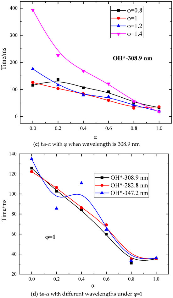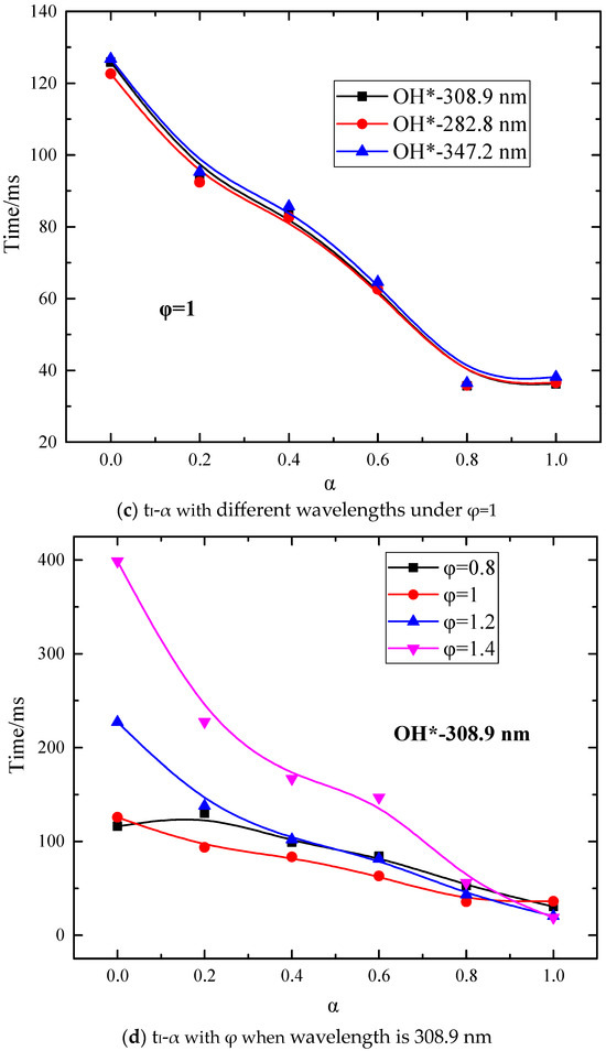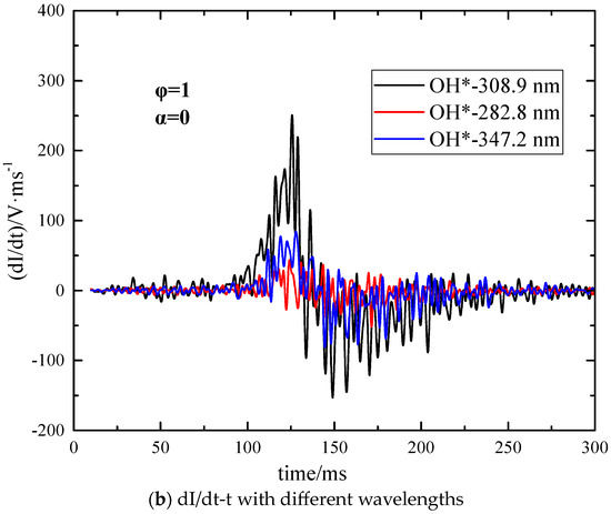 - As the volume fraction of hydrogen increases, the Imax and (dI/dt)max of OH continue to increase. At a higher equivalence ratio, the Imax of OH begins to increase sharply from α = 0.6. The emission intensity of OH at 282.8 nm is the earliest, and the emission intensity of OH at 347.2 nm is the latest. The corresponding time parameters of emission intensity of OH continued to decrease.