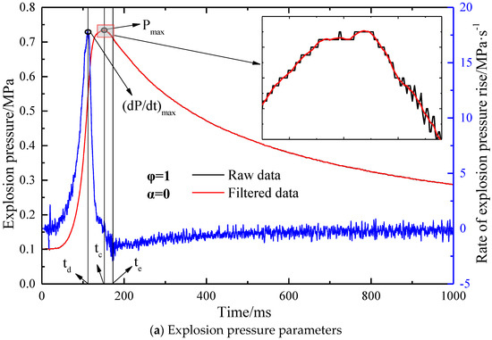 The explosion pressure is obtained by a pressure sensor with a measurement range of −0.1 to 2 MPa and a response time of 0.2 ms (Endress & Hause, Lörrach, Germany). The measured pressure curves are processed by the data acquisition system to obtain the explosion parameters directly, such as maximum explosion pressure (Pmax), the maximum rate of explosion pressure rise ((dP/dt) max), and the explosion time (tc) [34].