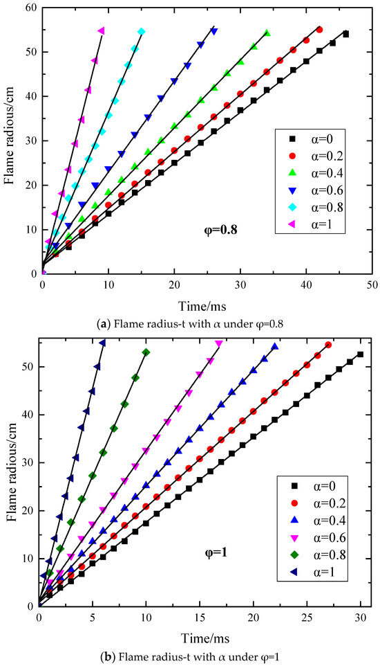Figure 6 illustrates the evolution of flame radius with time and α when φ = 0.8~1.4 (because of the gravity instability, the curve of flame radius with time when φ = 1.4 and α = 0 is not given, which is analyzed below). The results show that the flame radius and time show a linear growth relationship under all conditions. In summary, the addition of hydrogen accelerates the process of flame propagation, and the duration of the flame propagation to the visible boundary decreases, that is, the flame has a larger radius in the meantime. Furthermore, with the increase in α, the acceleration effect is increasing. For the flame front speed, it is only necessary to derive the curves of the flame radius with time. The effects of φ and α on flame propagation speed are similar to those on flame radius. This paper no longer elaborate on this.