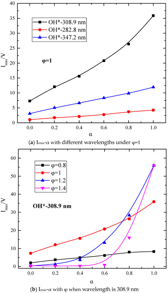 Figure 9 exhibits the trends in the maximum emission intensity (Imax) and the corresponding maximum time of emission intensity (tI) of OH in the flame of H2/CH4 mixture explosion under different variable conditions. When φ is constant, the Imax of OH continues to increase as α increases. When φ = 1 and φ = 0.8, the Imax of OH shows a linear upward trend with a small amplitude. Nilsson et al. [43] also found that the concentration of OH with the hydrogen content in the gas mixture increases linearly. The increase in α makes the system have more H radicals, and H produces more OH after oxidation, which makes the detected OH value increase continuously. For the case of φ = 1.2 and φ = 1.4, the Imax of OH shows an exponential upward trend with a sudden increase from around α = 0.6 of 12,763.6% and 12,204.4%, respectively. When φ = 1.2 and φ = 1.4, there is an oxidative competition between hydrogen and methane. When α is greater than 0.6, the oxidation of hydrogen dominates, and a large amount of H oxidation produces a large amount of OH. It is worth mentioning that with the increase in α, the emission intensity at 308.9 nm is most affected and the growth rate is also the largest. When α is constant, with the increase in φ, the Imax of OH increases first and then decreases, and when φ = 1~1.2, the maximum value appears.